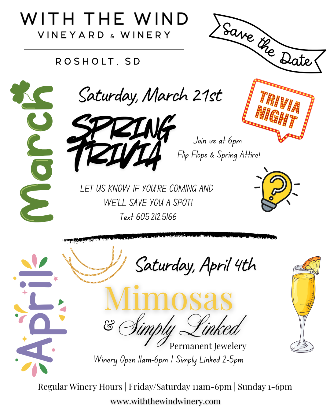 Please contact us for availability and details & to reserve your event: info@withthewindwinery.com or 605.537.4780.